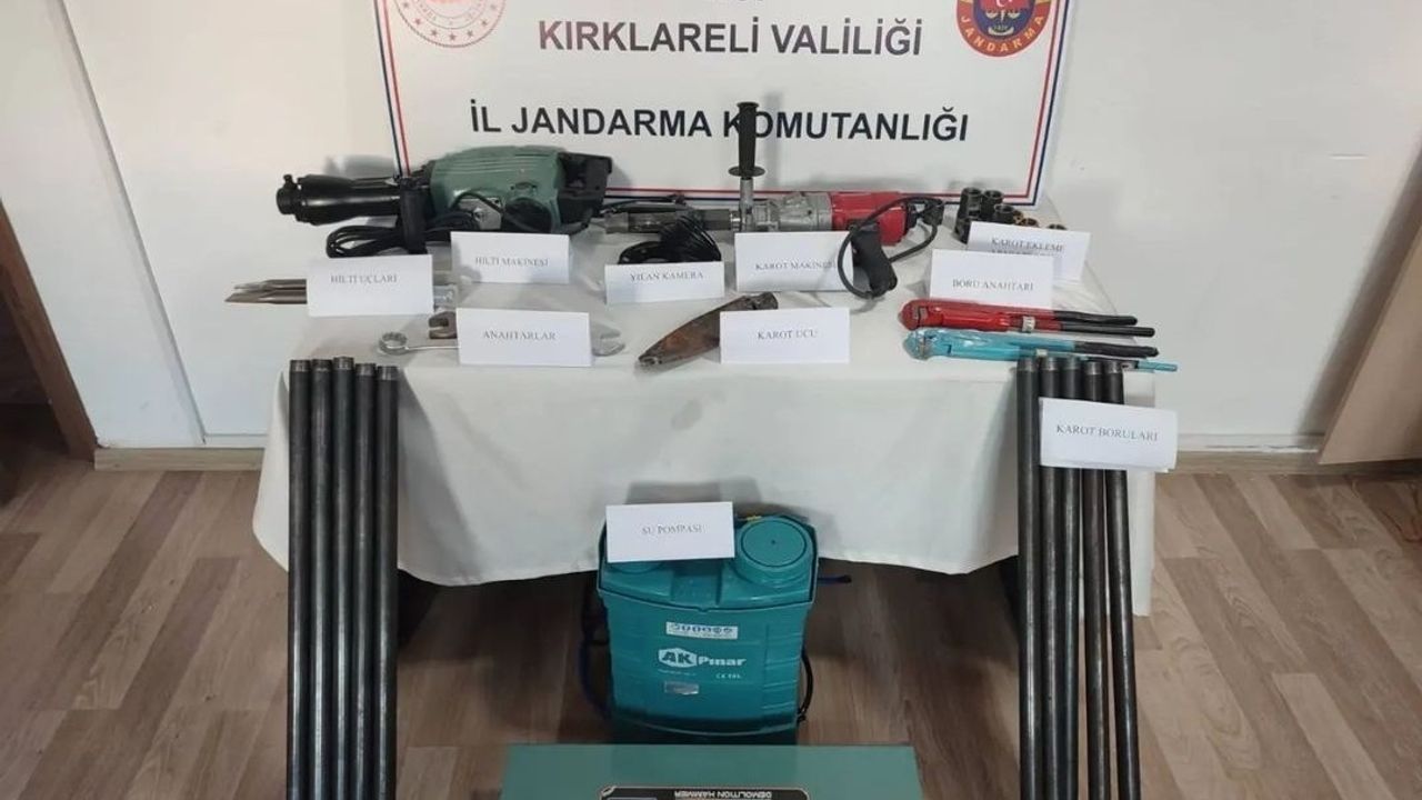 Alınan bilgiye göre, Kırklareli İl Jandarma Komutanlığına bağlı Kıyıköy Jandarma Karakol Komutanlığı ekipleri, 4 şahsı ekipmanlar ile kaçak kazı yaptıklarını fark etti. Ekipler tarafından düzenlenen operasyonda, B.K, A.0, Ö.K, S.K. isimli şahıslar izinsiz kazı yaptıkları esnada suçüstü yakalandı. Şahısların yakalandığı alanda yapılan aramalarda, 1 adet kırıcı hilti makinesi,1 adet delici karot makinesi, 1 adet hilti ucu, 1 adet yılan kamera, 4 adet boru anahtarı, 1 adet su pompası, 10 adet karot borusu, 1 adet karot ucu, 18 adet karot ekleme aparatı, 2 adet açık ağızlı anahtar ele geçirildi.