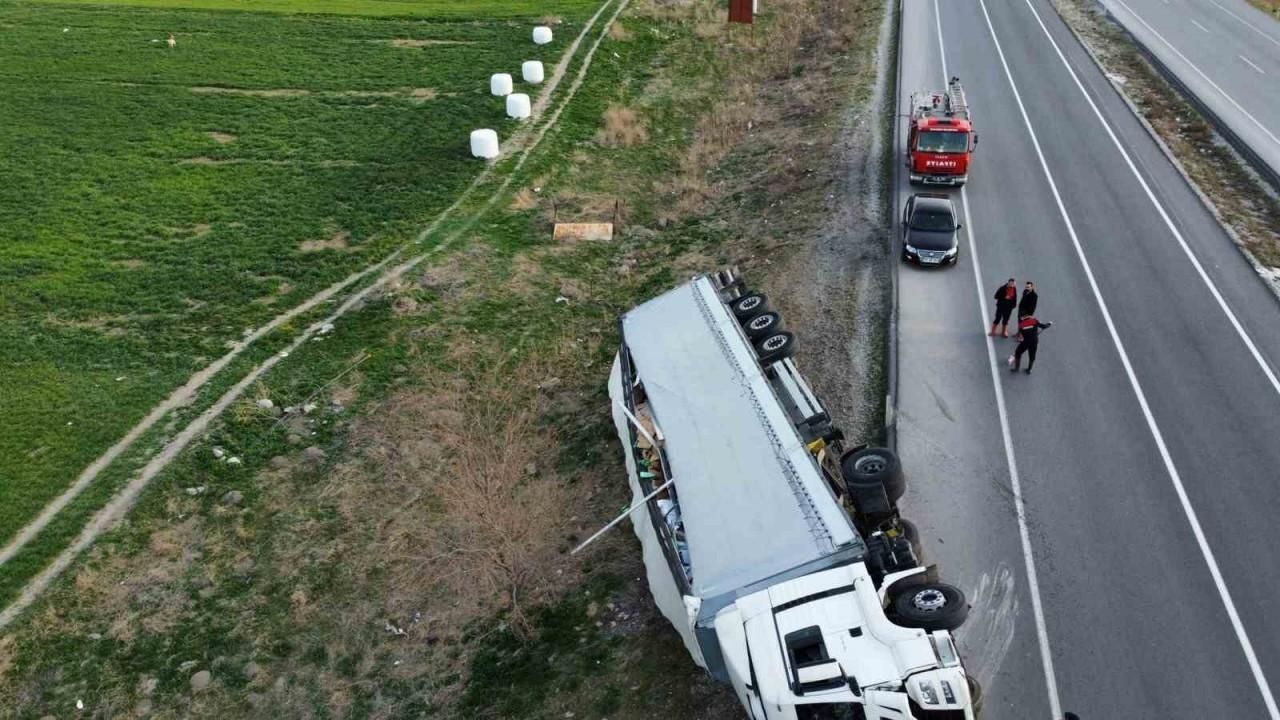 Afyonkarahisar’da temizlik malzemesi yüklü tır kontrolden çıkarak devrilirken, kaza da ölen ya da yaralanan olmadı.