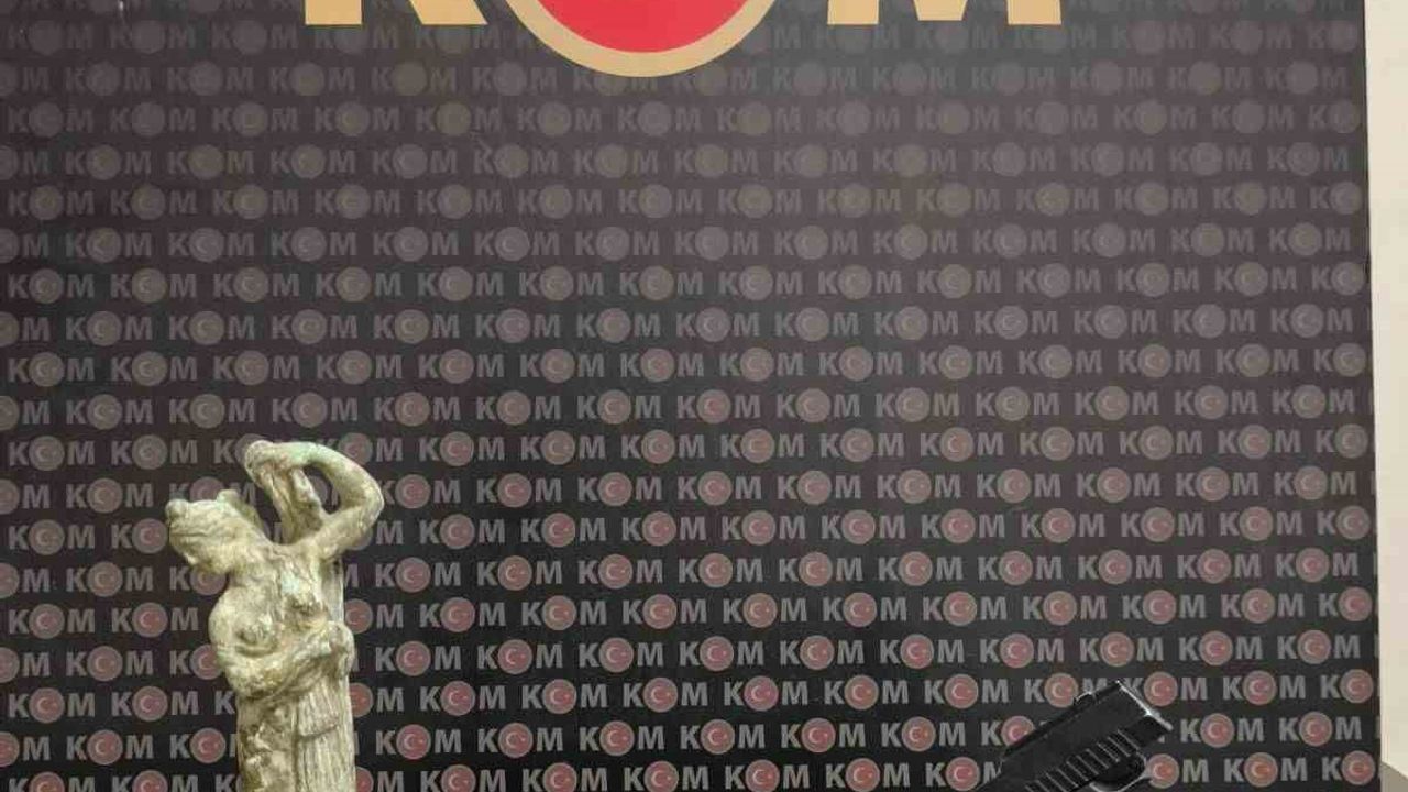 Aydın’ın Kuşadası ilçesinde şüphe üzerine durdurulan araçta Afrodit betimlemeli heykel ve kurusıkı tabanca ele geçirildi.