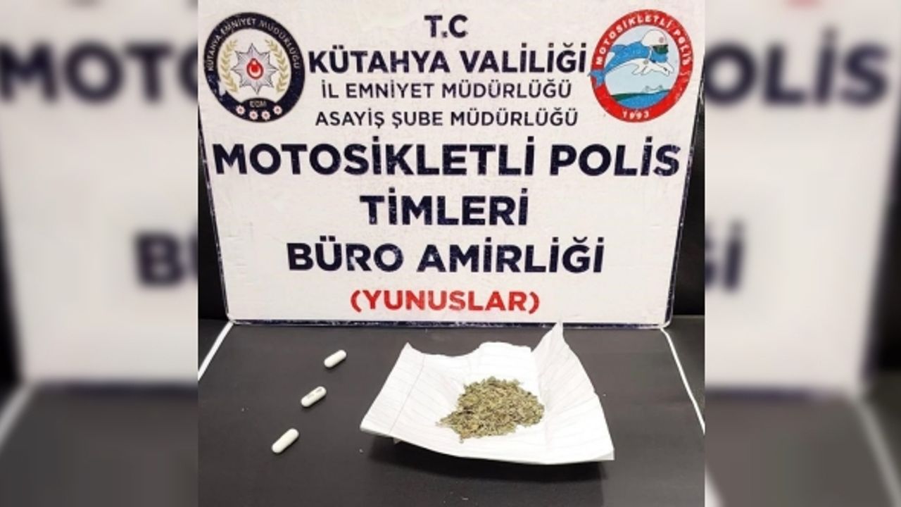 Kütahya’da Motosikletli Polis Timlerince durdurulan araçta ve 2 kişinin yapılan üst aramasında, 3,09 gram bonzai ve 3 adet sentetik ecza hap ele geçirildi.