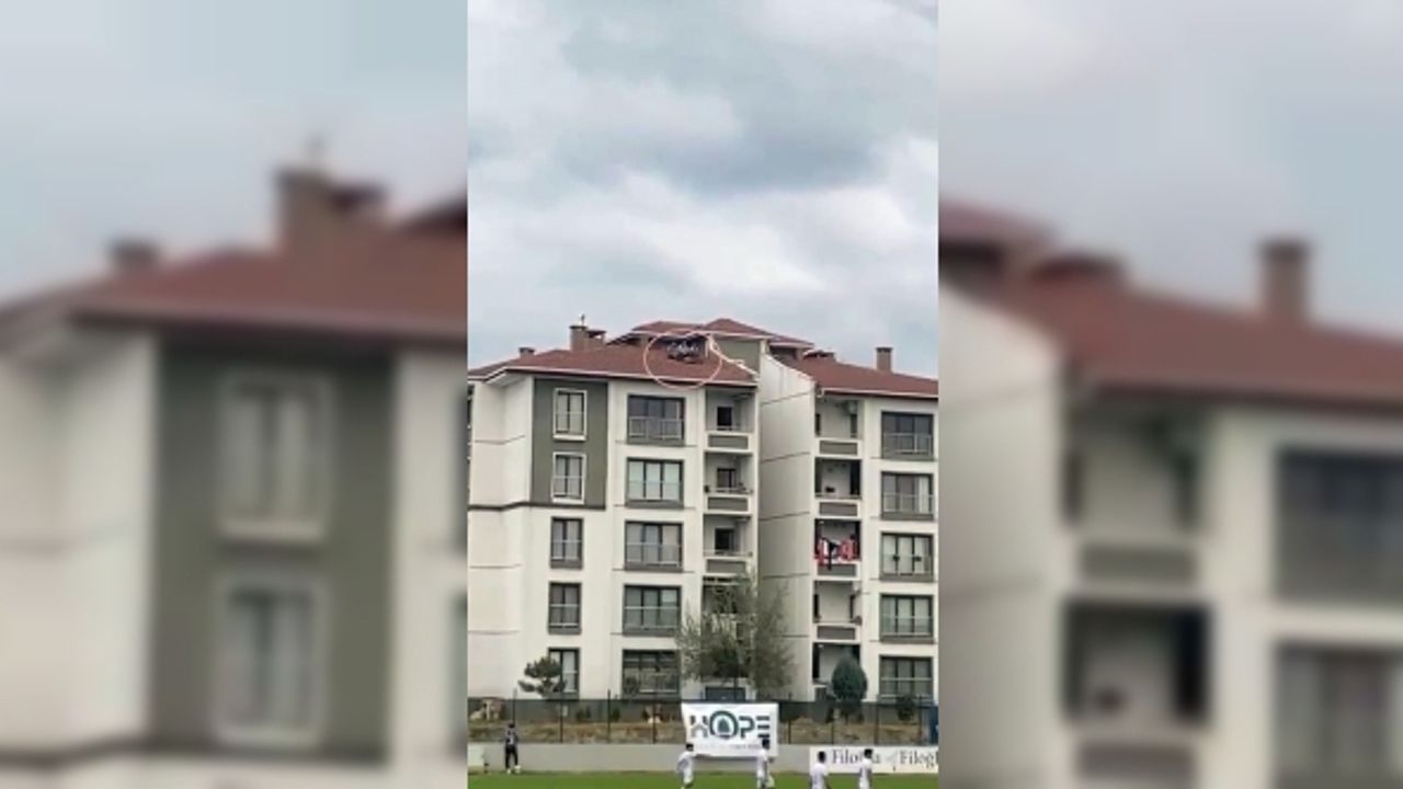 Sakarya’nın Sapanca ilçesinde Türkiye Kupası 1. Tur eleme maçında ilginç görüntü kaydedildi. 3 kişi stadın yanında bulunan dört katlı binanın çatısından maçı takip etti. Vatandaşların canlarını hiçe saydığı anlar ise cep telefonu ile saniye saniye görüntülendi.