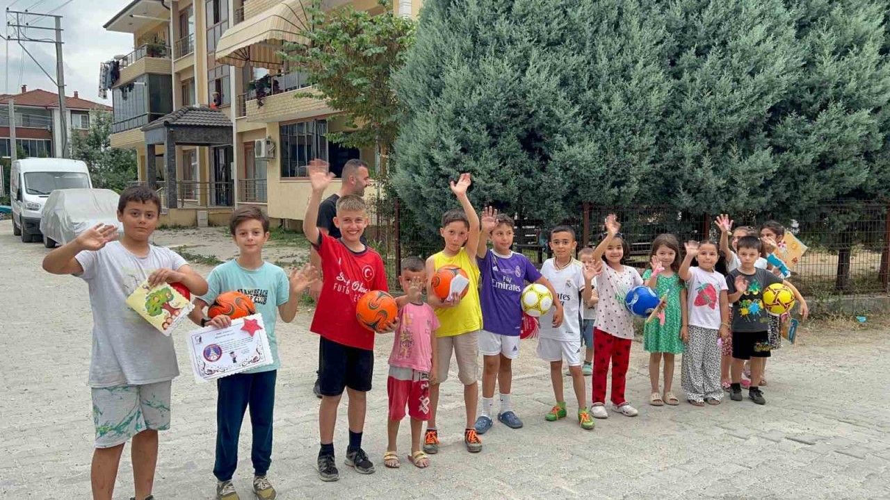Sakarya’nın Akyazı ilçesinde karnelerini alarak 86 günlük yaz tatiline giren öğrencilere, mahalle muhtarı top ve anahtarlık hediye etti.