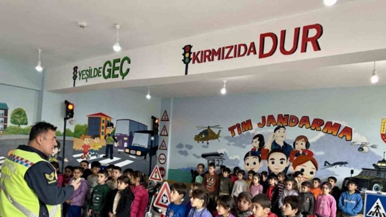 Muş İl Jandarma Komutanlığı trafik ekipleri, Korkut ilçesine bağlı Altınova Beldesi İlkokulundaki 48 öğrenciyi trafik kuralları hakkında bilgilendirdi.