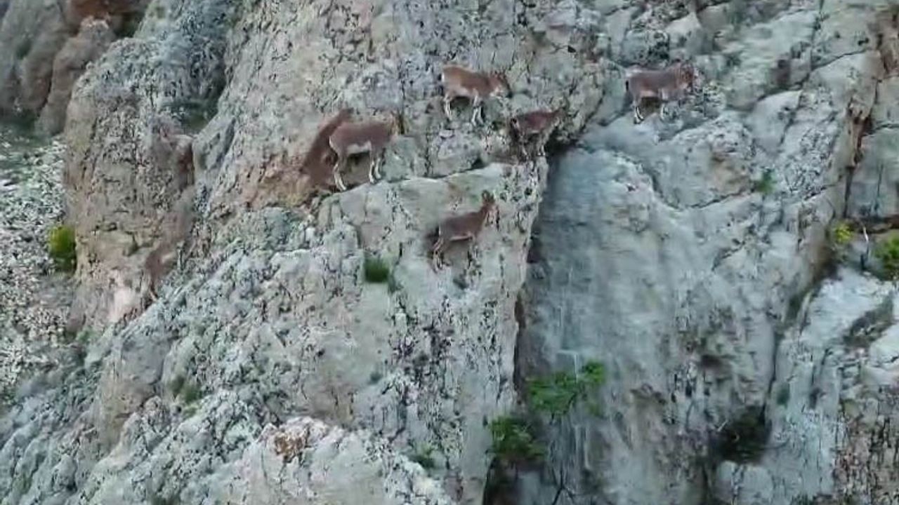 Elazığ’da nesli tükenme tehlikesi altında olması nedeniyle koruma altında olan dağ keçileri, Palu Kalesi’nde dronla görüntülendi.