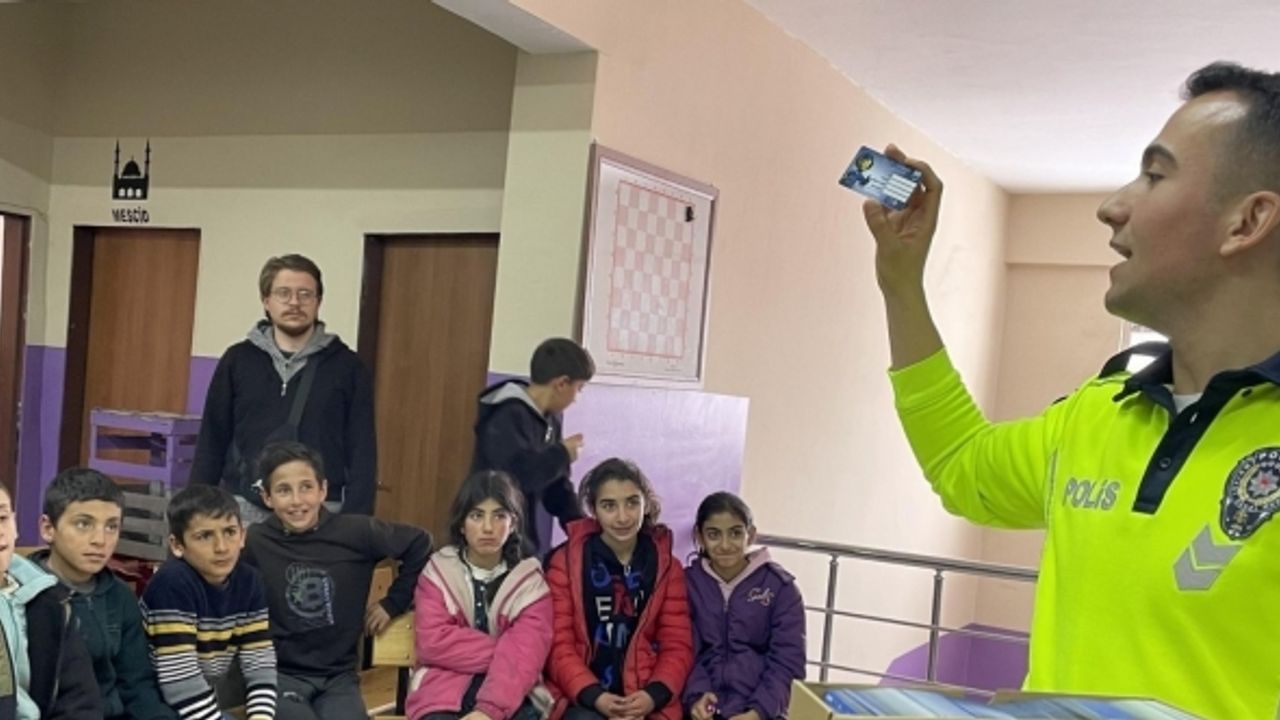 Erzurum Emniyet Müdürlüğü ekipleri öğrencilere yönelik trafik farkındalığını geliştirmek için eğitimler veriyor.