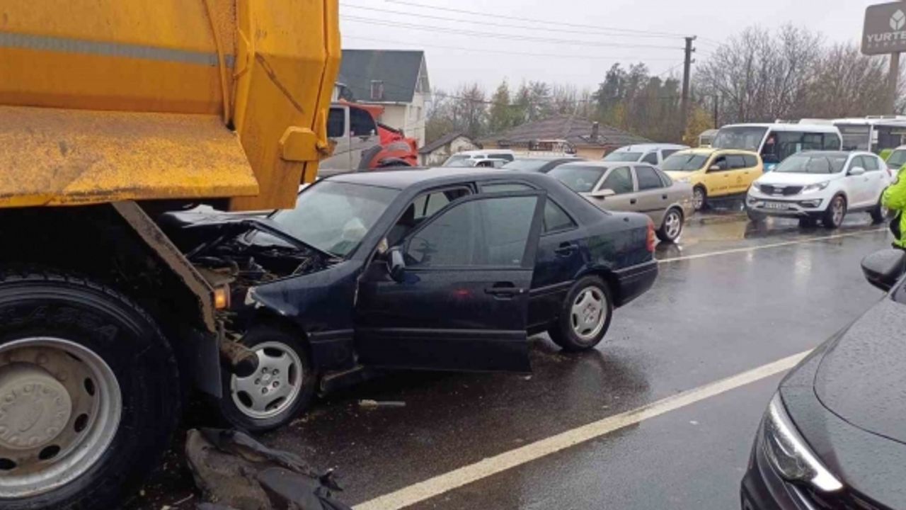 655 Karayolu ışıklı kavşakta bekleyen kamyona durmayan otomobil ok gibi saplandı, kazada 1 kişi yaralandı.