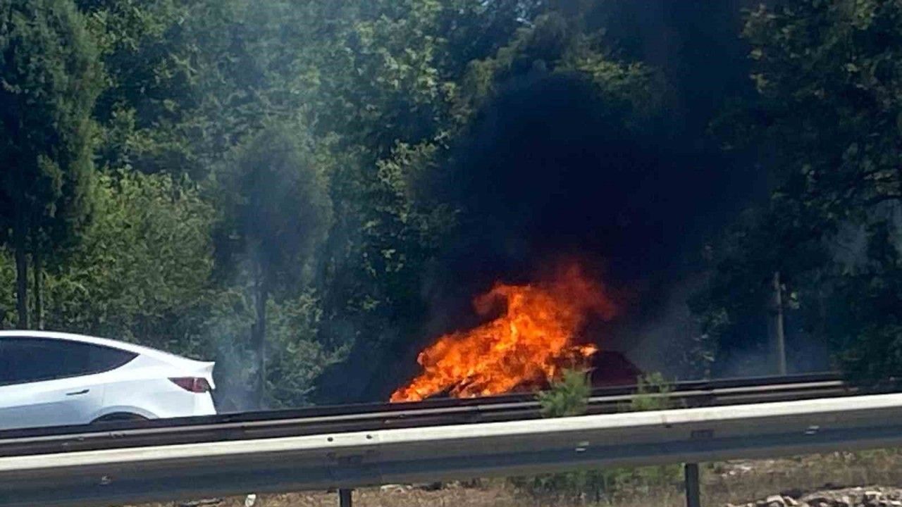 Anadolu Otoyolu Sakarya geçişinde seyir halindeyken yanan otomobil, alev topuna döndü. İtfaiyenin müdahalesiyle söndürülen yangında otomobilden geriye sadece demir yığını kaldı.