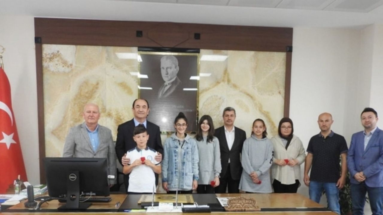 Kaymakam Ahmet Altıntaş, Milli Eğitim Müdürü Veysel Çalık’ın da hazır bulunduğu ziyarette Okul Müdürü Ahmet Deniz, Danışman Öğretmen Serkan Zengin ve öğrenciler Elif Sude Akın, Nisa Demirhan, Zeynep Özdemir, Fatmanur Aydoğan ve Mehmet Enes Zengin’i kabul etti.
