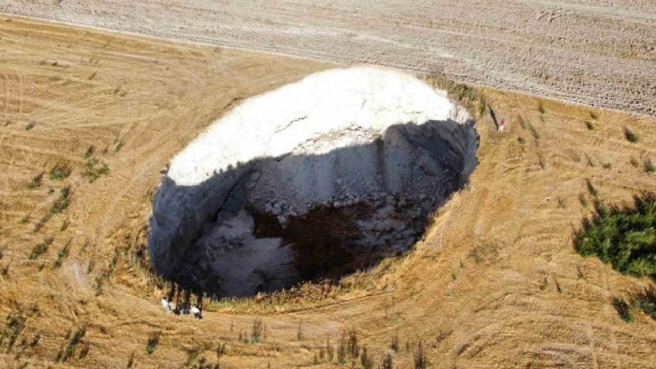 Konya’nın Karapınar ilçesinde aynı günde 1’i evin yakınındaki arazide, 2’si de farklı mevkide aynı tarlada olmak üzere 3 yeni obruk meydana geldi. Rüyasında deprem ve göçük olduğunu gören çiftçinin evine yaklaşık 100 metre mesafedeki, 50 metre çapındaki obruk korkuttu.