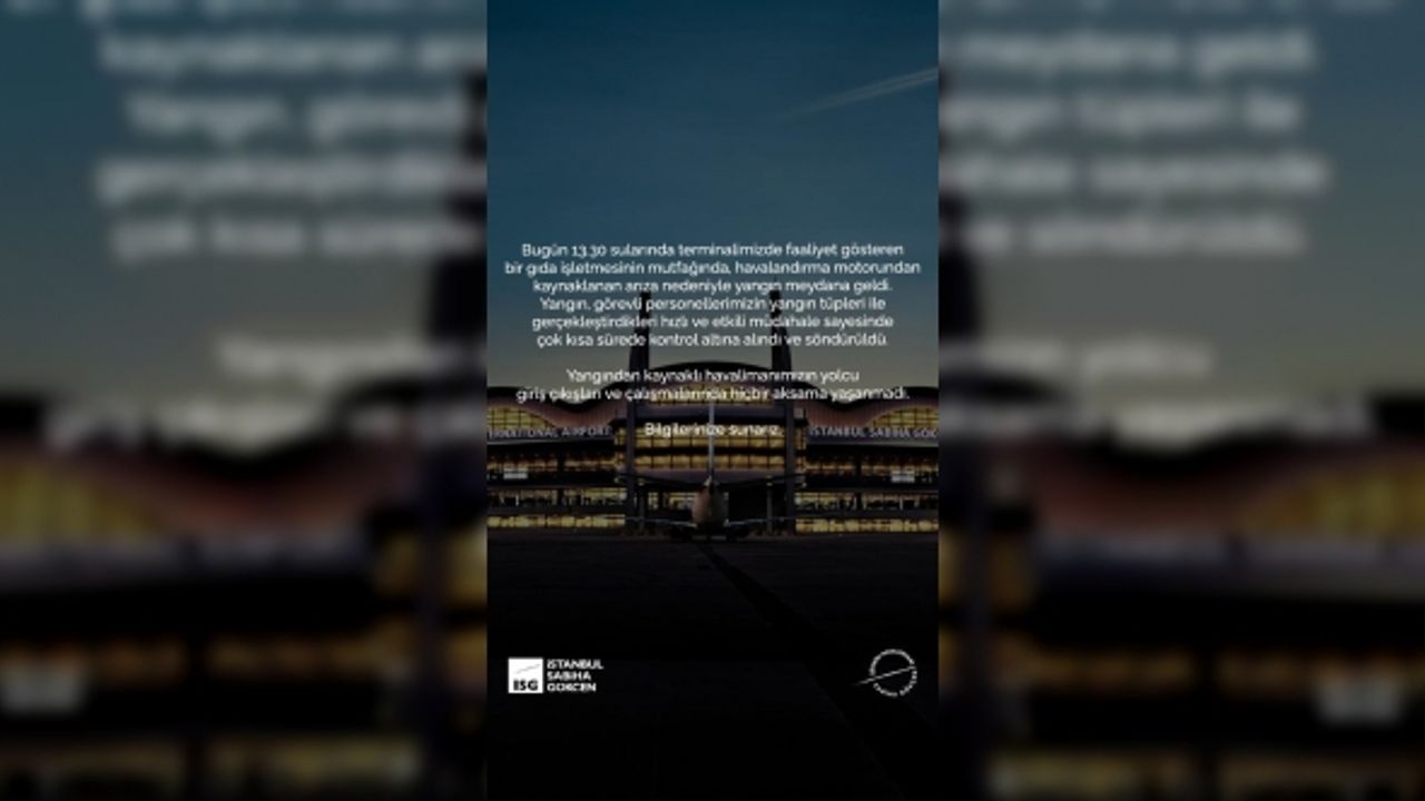 Bugün saat 13.30 sıralarında Sabiha Gökçen Havalimanı’nda bulunan bir gıda işletmesinin mutfağından yayılan duman hakkında Sabiha Gökçen Havalimanı İşletmesi ISG tarafından açıklama yapıldı. Açıklamada, “Bugün saat 13.30 sularında, İstanbul Sabiha Gökçen Havalimanı terminalimizde faaliyet gösteren bir gıda işletmesinin mutfağında, havalandırma motorundan kaynaklanan arıza nedeniyle yangın meydana geldi. Yangın, görevli personellerimizin yangın tüpleri ile gerçekleştirdikleri hızlı ve etkili müdahale sayesinde çok kısa sürede kontrol altına alındı ve söndürüldü. Yangından kaynaklı havalimanımızın yolcu giriş çıkışları ve çalışmalarında hiçbir aksama yaşanmadı" ifadelerine yer verildi.