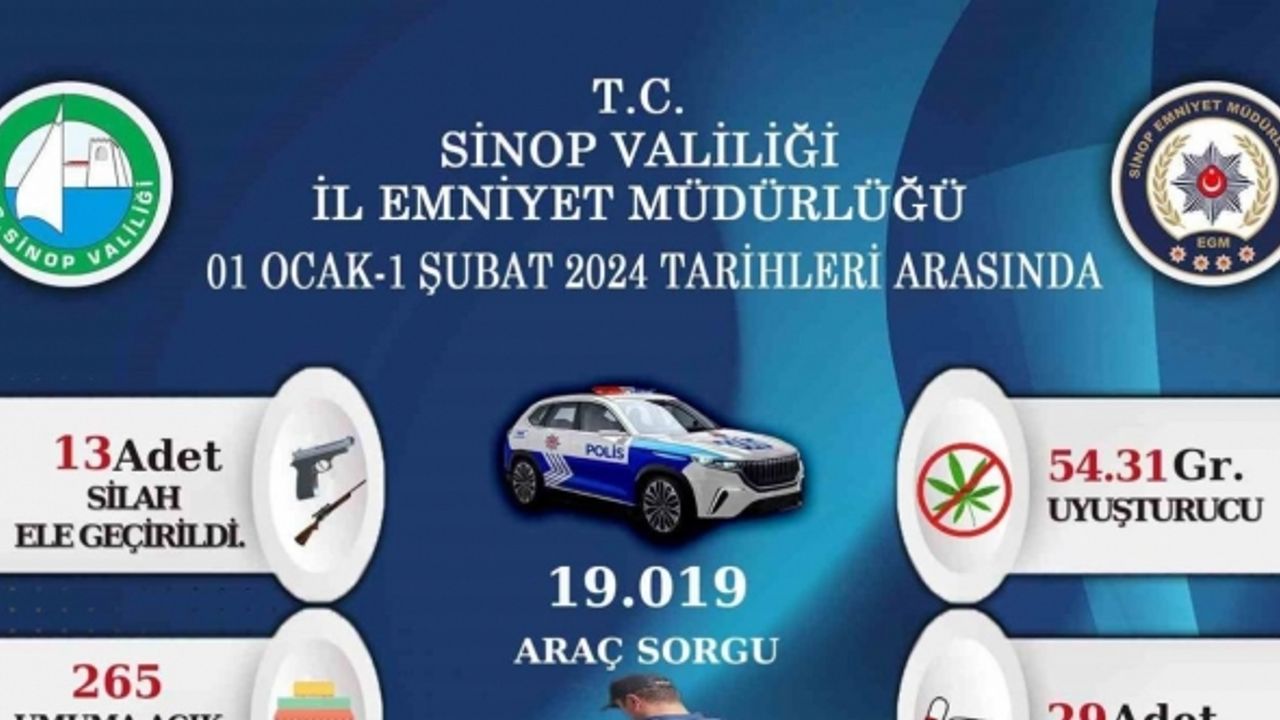 Sinop İl Emniyet Müdürlüğü’nce 01 Ocak-01 Şubat 2024 tarihleri arasında yapılan denetimlerde 13 adet silah ele geçirildi. 265 umuma açık iş yeri kontrol edildi, 28 hırsızlık şüphelisi yakalandı. 6 günübirlik yer denetimi yapıldı, 19 bin 19 araç sorgusu, 23 bin 724 GBT sorgusu gerçekleştirildi, 26 aranan şahıs yakalandı. 54,31 gram uyuşturucu, 29 adet sentetik ecza, 214 bin 920 dal makaron ve 40 kilo tütün ele geçirildi.