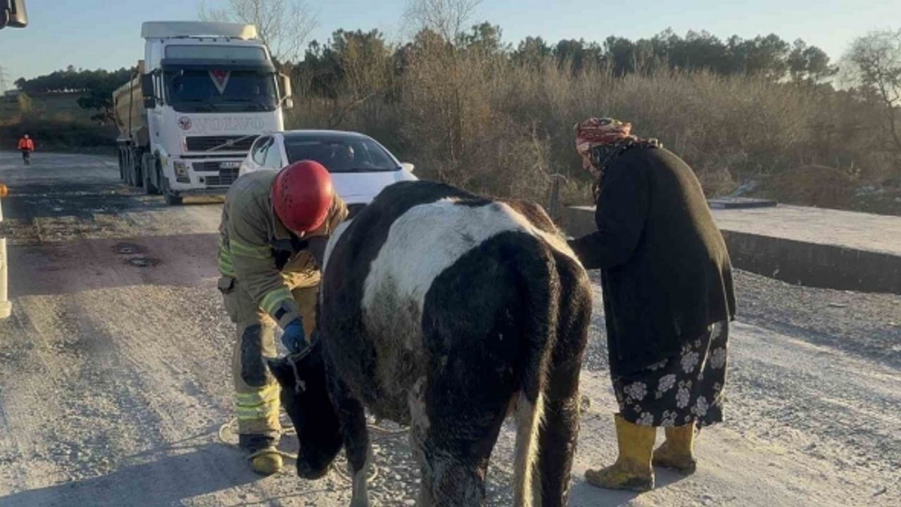 Arnavutköy’de hayvanlarını otlaması için çayırlık araziye çıkartan yaşlı kadının bir ineği sulama kanalına düştü. İneği düştüğü yerden itfaiye ekipleri çıkarırken, yaşlı kadın saatlerce hayvanının başından ayrılmadı.