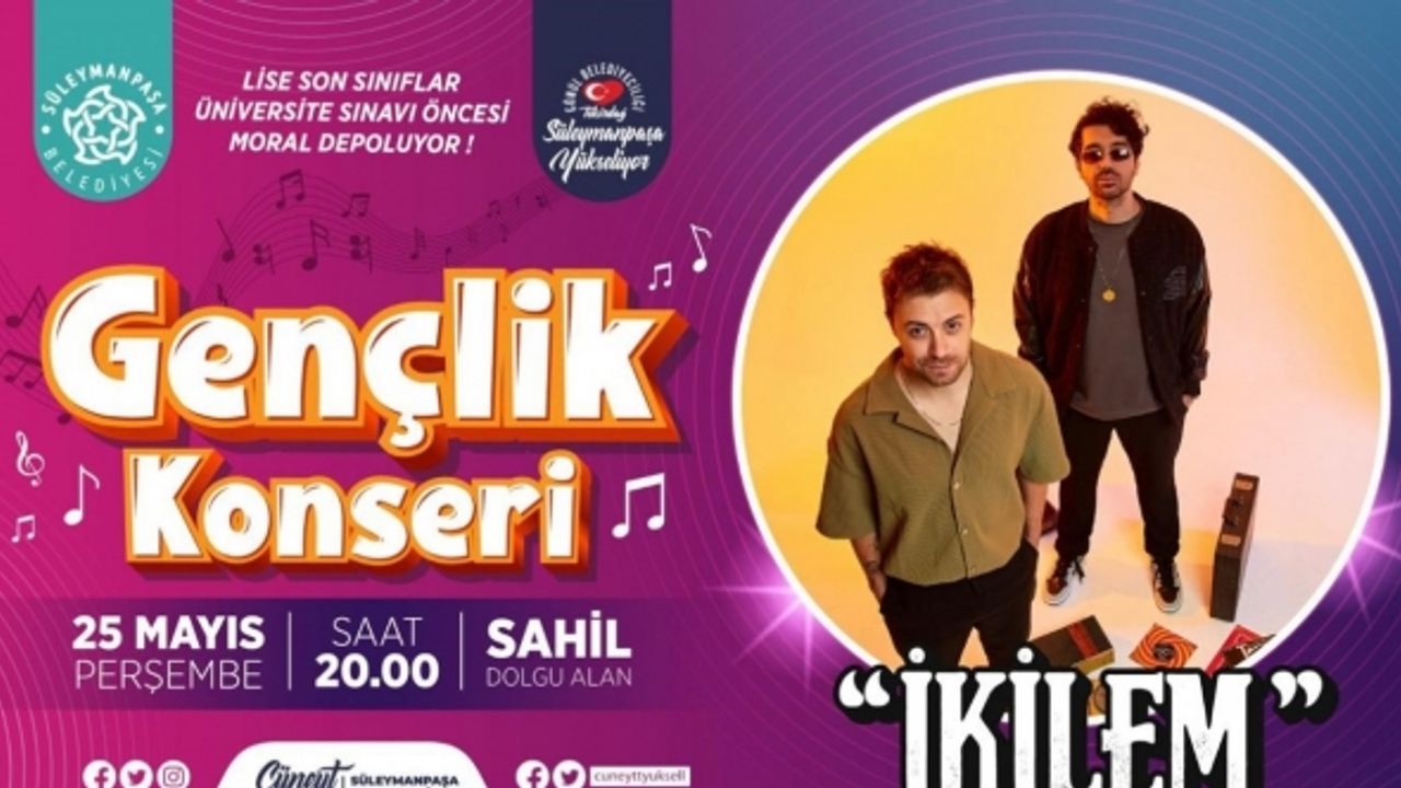 25 Mayıs Perşembe günü saat 20.00’de, Sahil dolgu alanda gerçekleştirilecek olan konserde, gençler arasında oldukça popüler olan İkilem grubu sahne alacak. Sevilen şarkılarını Süleymanpaşalı gençler için seslendirecek olan topluluk, Süleymanpaşa’da ilk kez konser verecek.