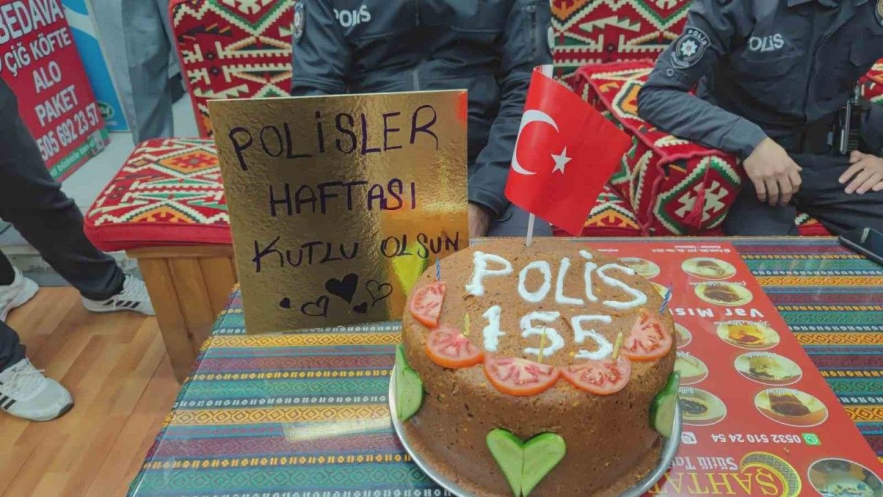 Olay dün akşam saatlerinde Cebeci Mahallesi Atatürk bulvarı üzerinde yaşandı. Osman Durmuş isimli esnaf, 112’yi arayarak asılsız ihbarda bulunduktan sonra arkadaşları ile birlikte ekiplerin gelmesini bekledi. Kısa süre sonra ihbarın yapıldığı adrese gelen ekipler, içeriye girdiklerinde ise alkışlarla karşılanarak üzerinde mumların yandığı ve tamamen çiğköfteden yapılan pasta ile karşılaştı. İlk olarak manzara karşısında şaşıran ekiplere daha sonra ise mumları üfleten esnaf kestikleri pastayı da kendilerine ikram etti. Ardından bir süre sohbet eden polis ekiplerine hazırladığı paketleri hediye eden esnaf, Türk Polis Teşkilatının 179. yıl dönümünü kutlayarak kendilerini tebrik etti.