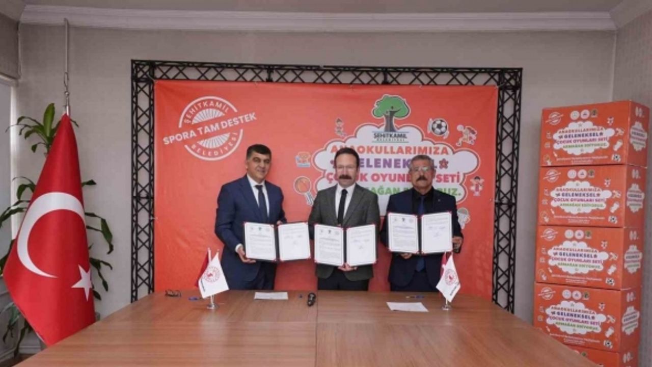 Şehitkamil Belediyesi ve Şehitkamil İlçe Milli Eğitim Müdürlüğü arasında imzalanan iş birliği protokolü ile anasınıfı öğrencilerini mutlu edecek örnek bir proje daha hayata geçirildi. Şehitkamil Kaymakamlığı’nda, Şehitkamil Kaymakamı Ömer Hilmi Yamlı, Şehitkamil Belediye Başkanı Rıdvan Fadıloğlu ve Şehitkamil İlçe Millî Eğitim Müdür Vekili Yusuf Alçık’ın imza altına aldığı protokol ile Şehitkamil İlçesindeki 29 farklı müstakil anaokuluna, geleneksel çocuk oyunları seti ve okul öncesi döneme uygun içerikte spor malzemeleri armağan edilecek. Fiziksel in aktivitenin beraberinde getirdiği sorunlara çözüm üretmek ve hareketli yaşam farkındalığını oluşturmak adına yürütülecek çalışmalarda eğitici eğitimleri, yarışma ve şenliklerde düzenlenecek.