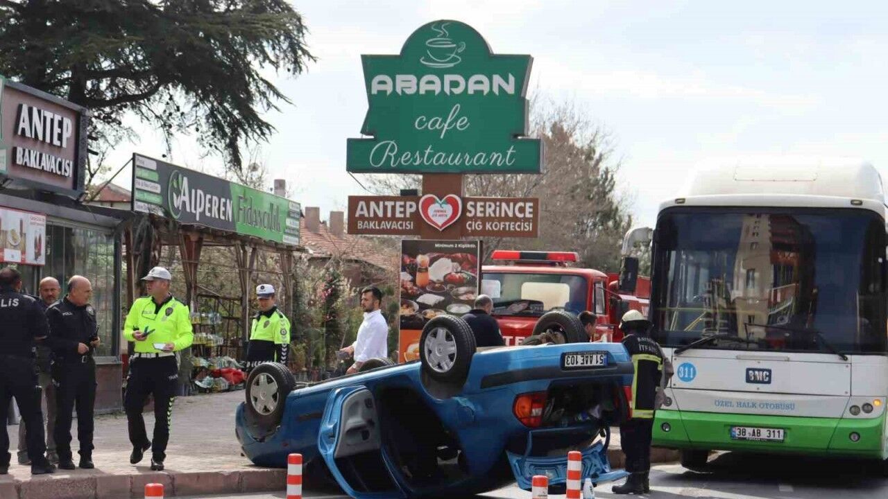 Kayseri’nin Kocasinan ilçesinde dönmek için ani manevra yapan otomobil, halk otobüsüne çarptıktan sonra ters döndü. Kazada otomobilde bulunan 2 kişi, burunları bile kanamadan çıktı.