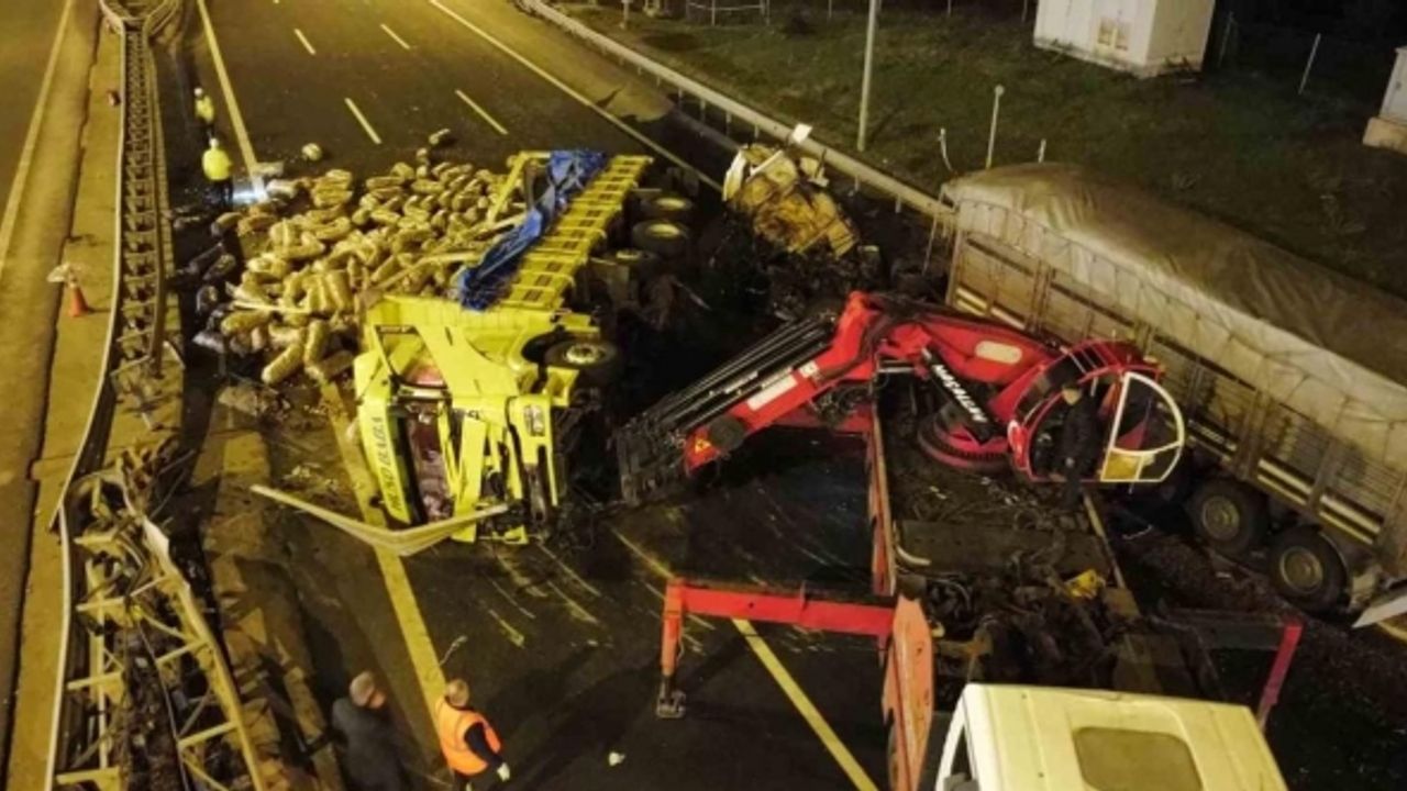 Anadolu Otoyolu Düzce geçişinde tır ile kamyon çarpıştı. Otoyolun İstanbul istikameti trafiğe kapanırken, yolu açma çalışmaları havadan dron ile görüntülendi.