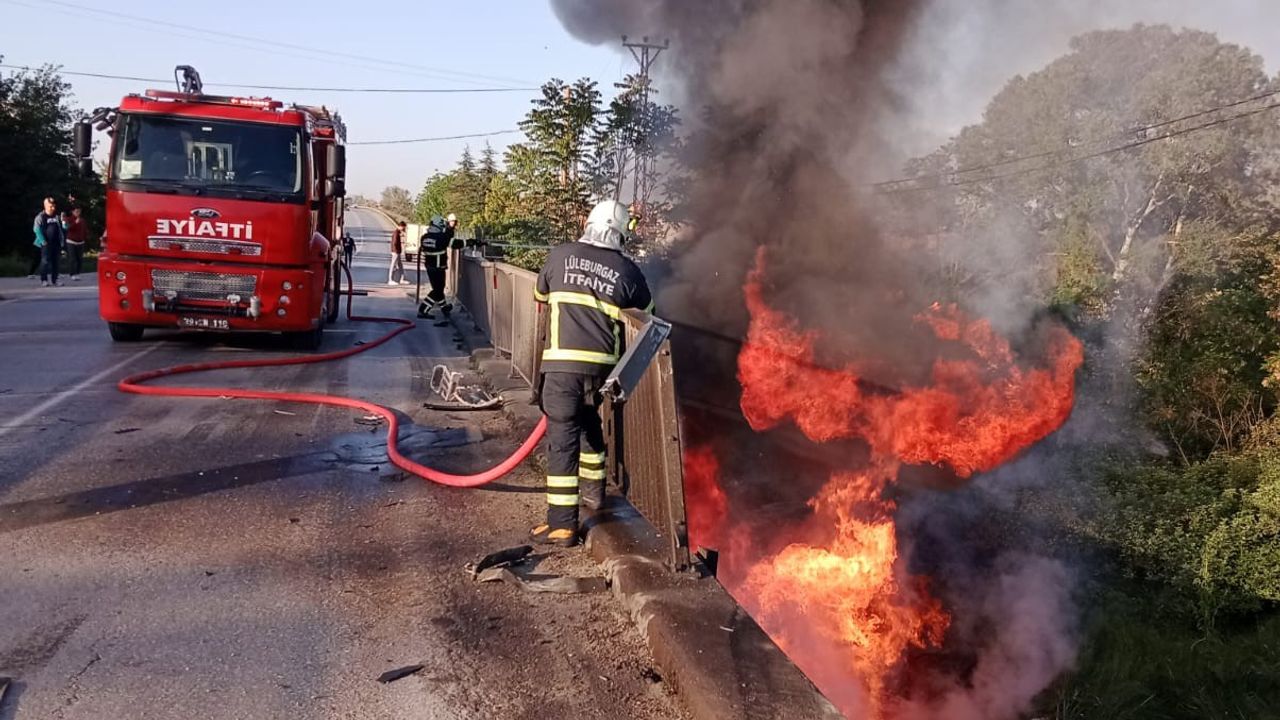 Yaşanan tek taraflı kazada 39 ABP 347 plakalı tırda yangın başladı ve olay yerine gelen itfaiye ekipleri yangını söndürdü.