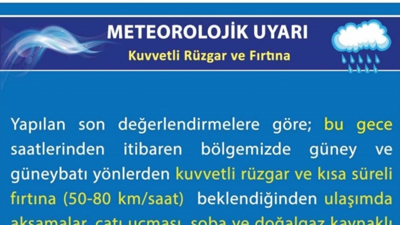 Uşak Valiliği, bu gece saatleri itibariyle etkisini göstermesi beklenen kuvvetli rüzgar ve kısa süreli fırtına şeklinde esmesinin beklendiğini bildirerek vatandaşları uyardı.
