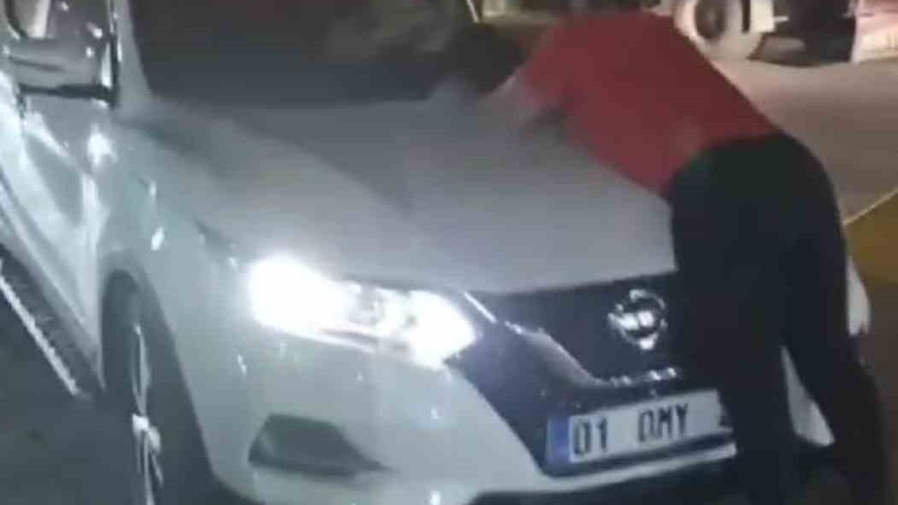Adana’da kadın sürücünün kullandığı otomobilin kaputuna asılan madde bağımlısı olduğu öne sürülen şahıs kadına dehşet yaşattı.