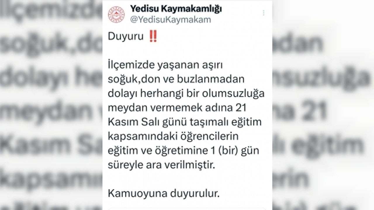 Bingöl’de dün başlayan yoğun kar yağışı nedeniyle Yedisu ilçesinde okullar pazartesi günü tatil ilan edilmişti. Yedisu Kaymakamlığı tarafından yapılan açıklamada, don ve buzlanma nedeniyle taşımalı eğitime bir gün ara verildiği duyuruldu. Açıklamada, "İlçemizde yaşanan aşırı soğuk, don ve buzlanmadan dolayı herhangi bir olumsuzluğa meydan vermemek adına 21 Kasım Salı günü taşımalı eğitim kapsamındaki öğrencilerin eğitim ve öğretimine bir gün süreyle ara verilmiştir" denildi.
